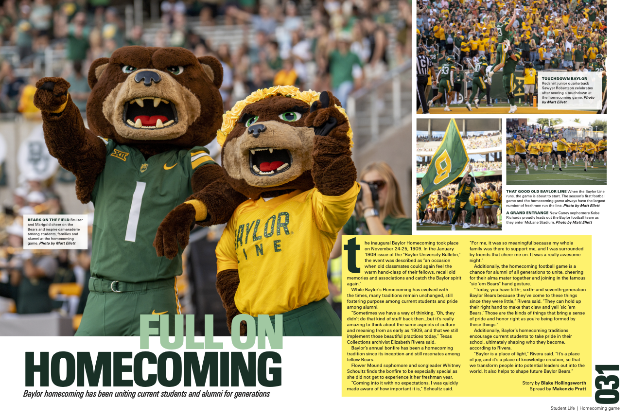I wanted this piece to feel both celebratory and timeless—a spread that future students and alumni could look back on and instantly remember the excitement of the game, the pride of seeing the Baylor Line run, and the joy of being part of a community united in tradition. By combining narrative storytelling with powerful visual moments, the design serves as a permanent reminder of the unforgettable memories made at the Baylor Homecoming Game.